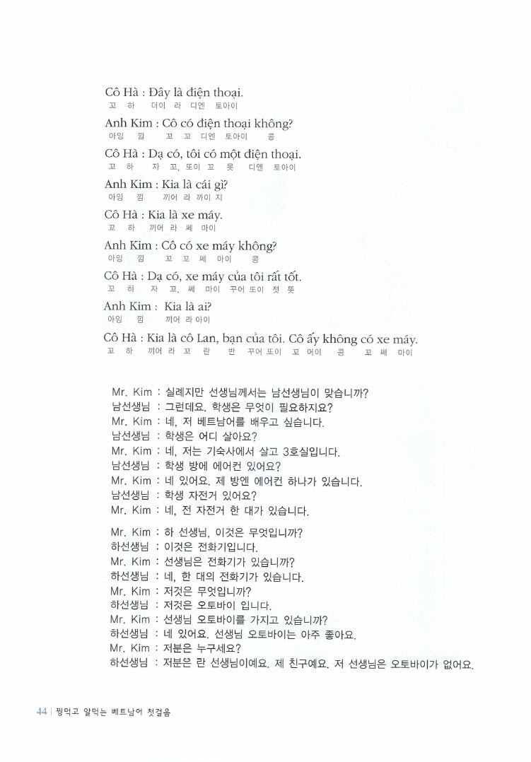 Bước đầu học tiếng Việt cho người Hàn Quốc là tài liệu thiết kế đặc biệt dành cho người Hàn Quốc muốn học tiếng Việt từ cơ bản. Phiên bản PDF kết hợp với Mp3 giúp người học vừa đọc vừa nghe, thuận tiện cho việc học mọi lúc mọi nơi và rèn luyện cả kỹ năng nghe và phát âm. Đây là tài liệu hữu ích cho sinh viên, người đi làm hoặc khách du lịch muốn nhanh chóng làm quen với tiếng Việt.