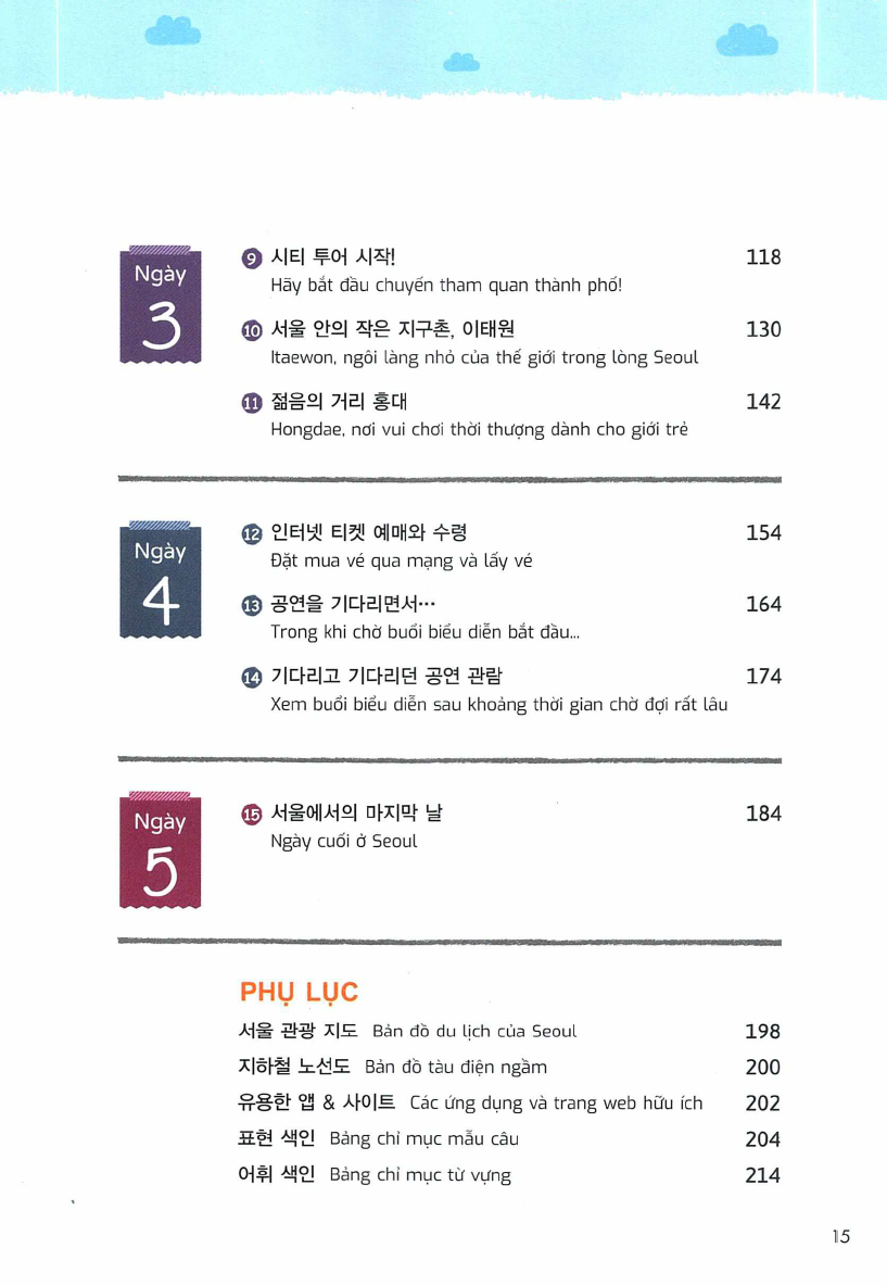 Nội dung sách được chia thành nhiều chủ đề quen thuộc như đặt phòng khách sạn, hỏi đường, mua sắm, giao tiếp tại sân bay, dùng phương tiện công cộng, cùng các tình huống đặc trưng của fan K-Pop như mua album, xin chữ ký, trò chuyện với nhân viên tại địa điểm tổ chức concert hay tìm quán cà phê do idol yêu thích. Các mẫu câu đều được trình bày đơn giản, kèm phiên âm dễ đọc để người học tiếp thu nhanh.