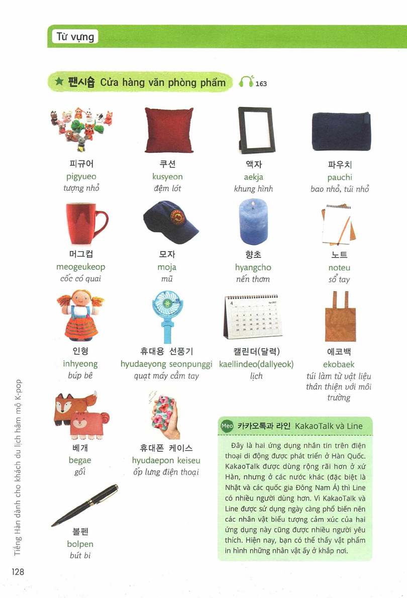 Cuốn sách dành cho những bạn chuẩn bị du lịch Hàn Quốc và muốn giao tiếp đơn giản nhưng hiệu quả trong các hoạt động du lịch và sự kiện K-Pop. Đây cũng là lựa chọn lý tưởng cho người yêu văn hóa Hàn, muốn học vài câu cơ bản để tương tác với idol hoặc cộng đồng fan quốc tế.