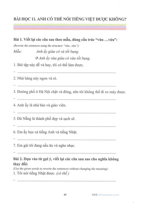 Với thiết kế khoa học, đa dạng dạng bài và bám sát giáo trình, Sách Bài tập Tiếng Việt 123 chính là người bạn đồng hành hiệu quả giúp người học tự tin chinh phục tiếng Việt. Bộ sách không chỉ phù hợp cho tự học mà còn là tài liệu giảng dạy chất lượng trong các lớp học tiếng Việt cho người nước ngoài.