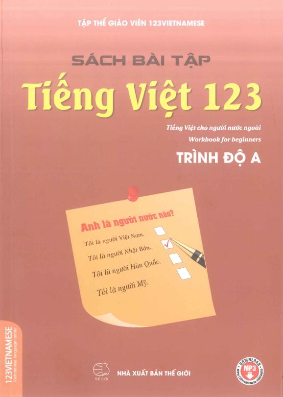 Sách Bài tập Tiếng Việt 123 là tài liệu đi kèm với bộ giáo trình Tiếng Việt 123, được thiết kế nhằm giúp học viên củng cố kiến thức đã học qua thực hành. Với nhiều dạng bài đa dạng, sách giúp người học không chỉ ghi nhớ từ vựng, ngữ pháp mà còn rèn luyện kỹ năng nghe, nói, đọc, viết một cách toàn diện.